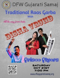 Join us for an unforgettable Garba night with the talented Disha Vrund at the DFW Hindu Temple. It’s an invitation to celebrate the vibrant rhythms of Navaratri through the art of Garba. As the sun sets, we’ll come together to light up the night with music, dance, and boundless joy. Disha Vrund’s mesmerizing melodies will set the stage on fire, and you’re invited to dance to the beats of celebration. It’s a night where we create cherished memories, celebrate our cultural heritage, and immerse ourselves in the spirit of unity. Come, be a part of this vibrant and spirited Garba celebration, and let’s make this night truly unforgettable!